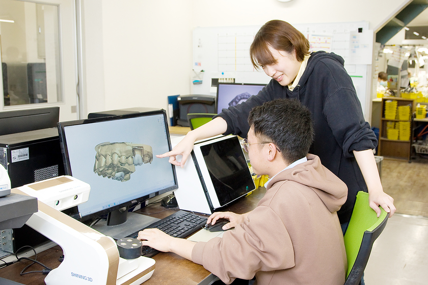 歯科技工士は歯科医から依頼を受けて歯の被せ物や入れ歯などを作る技術職です。私が担当している業務は、パソコンで失われた歯の設計・デザインをしたり、セラミックなどで作っている技工物を削って調整。最後に先輩の最終チェックを経て完成です。学ぶべきことも多いですが、新しい技術を習得できたり、自分が設計・デザインしイメージ通りのものができた時にやりがいを感じますね。先輩の技術を早く習得して、ピタッとはまる完成品を作れるようになりたいです。合わない技工物は体に支障をきたすこともあるので、人の健康を守る仕事という点にもやりがいを感じ、超高齢化社会が進む今、需要も高い歯科技工士としてスキルを上げていきたいです。