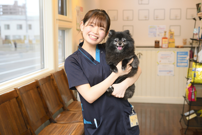 私の業務は、診察補助、お薬の用意、検査や手術の助手、受診の電話対応から受付、入院やペットホテルに来ている動物たちのお世話など多岐に渡りますが、日々仕事は充実しています。動物病院は動物たちだけではなく、その飼い主さまとのコミュニケーションが重要です。飼い主さまは不安を抱えて来院し、言葉を話せない動物たちに代わりどのように体調が悪いのかお話してくれます。私たち愛玩動物看護師の仕事は獣医師のサポート業務だけではありません。飼い主さまと獣医師を繋ぐ仕事でもあるので、飼い主さまを通して動物たちに寄り添うことで、飼い主さまと動物たちが安心して暮らしていけるサポートができることもやりがいの一つです。