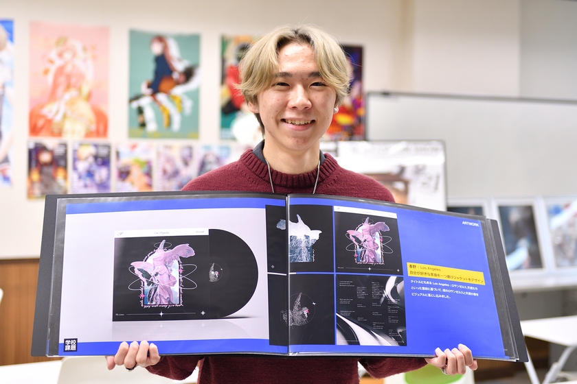 子どもの頃からゲームと音楽が大好きで、CDジャケットなどのデザインに興味があり、デザイナーを目指すようになりました。この学校は先生や先輩方の優しさと、個性を伸ばせる自由度の高さに魅力を感じ選びました。