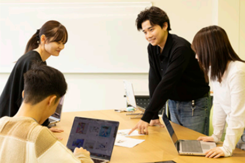 授業では、全員が自分専用のMacBookを持ち、SlackやZoomなどのビジネスツール、Adobe Creative Cloud(R)などのプロ用ソフトを日常的に使用します。これまでの「学校ではテキストがあるのが当然」という常識と離れ、現場の情報そのものが教材のため、変化が学びに変わります。