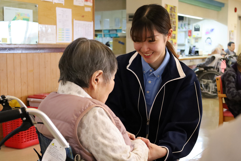 利用者様の食事、入浴、排泄の介助や、余暇時間を活用したレクリエーション活動(ラジオ体操や歌など)をサポートする仕事をしています。また、スタッフ間で連携しながら必要に応じて利用者様のケア内容を見直す支援、年に一度のケアプランの作成なども行っています。入職当初は仕事に慣れることに精一杯で疲れを感じることもありましたが、「ありがとう」という言葉や笑顔にやりがいを感じることができました。現在は、より多くの笑顔を引き出せるようコミュニケーションの取り方を意識しています。施設内には多職種の職員が働いており、利用者様だけでなく職員とのコミュニケーションを通じて関係性を築くことが自分自身の活力になっています。