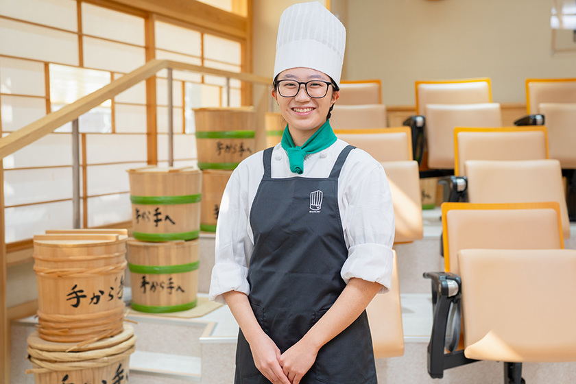 小さな頃から料理に興味があり、特に「食材」が「料理」に変貌していく工程に面白さを感じて調理師になろうと決意。学校見学で目にした校内の清潔さや在校生の挨拶の元気さに惹かれた本校で学ぶことにしました。