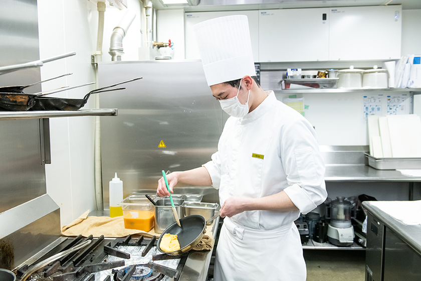 私は現在「ザ・リッツ・カールトン日光」のメインキッチンで働いています。これまではオムレツ・エッグベネディクトをはじめとした朝食の卵料理などを担当してきましたが、最近はディナーの前菜なども作らせていただけるようになりました。日頃、心掛けているのは国際的なホテルにふさわしい料理を妥協せずに作るということ。毎日、緊張の連続ですが任せてもらえることが増える楽しみもあり、だからこそ、もっと技術を磨こうという意欲も湧いてきます。総料理長の域に達するまでにどれほどの時間を要するのか見当もつきませんが、お客さまに味も香りも盛り付けも満足していただけるフレンチが作れるようになりたいと思っています。