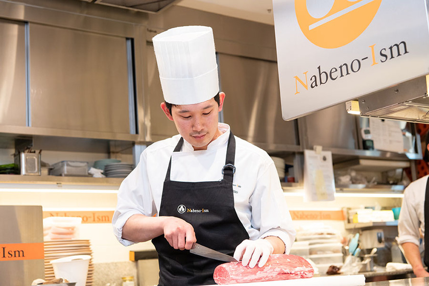 世界的に著名な渡辺雄一郎シェフがエグゼクティブシェフを務めるフランス料理店「ナベノイズム」のスーシェフ(副料理長)として、主に肉料理の下処理から火入れまでを担当しています。後輩たちの指導という重責もあり、調理場の動きを見ながらスムーズな調理とキッチンの調和を図るように心掛けています。季節ごとに変わる料理、使う食材は様々で新しい発見や仕事も自分にとっては楽しさの一つです。また、この店には何かの記念日など“特別な日にふさわしい食事”をしようと来店される方もいらっしゃるのですが、そういうお客さまが満足そうに帰られる姿や「美味しかったです」とシェフに話しかける声を聞くことが自分にとっても大きな喜びです。