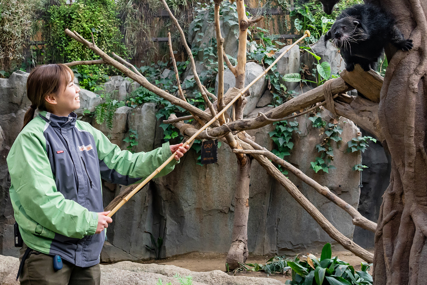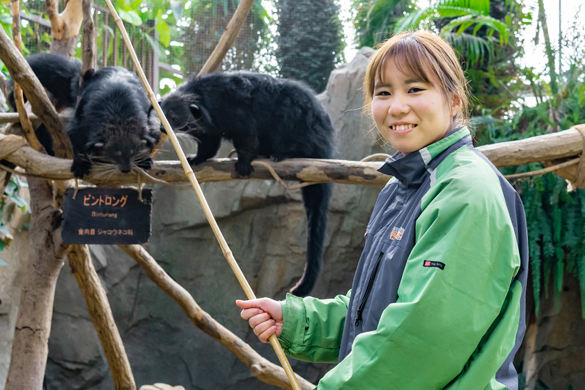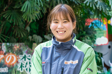 心がけているのは、お客様に感謝の気持ちを伝えたいので、まずはしっかり笑顔で挨拶をすること。そして気持ちよく園内を楽しんでいただけたらなと思っています。また、動物の命を預かっている仕事でもあるので、この環境で大丈夫なのか、動物に危険はないかなどについて、つねに気をつけること。それが動物や自分自身の身を守ることにも繋がります。ここは、人と動物との架け橋になってくれる場所です。今後チャレンジしたいことは、展示場をもっと動物の魅力が伝えれる場所にすること。また、展示場でも動物たちが落ち着ける場所をつくることです。そのためには、担当する動物の生態についてもっと深く理解することが大切だと思います。