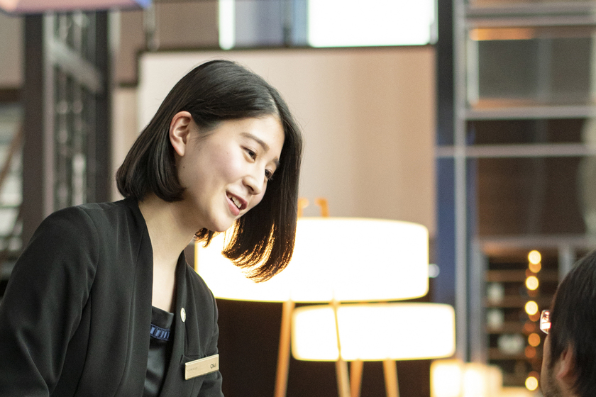 もともと英語を使った仕事に就きたいと思っていました。また、子どものころから家族で海外旅行に行く機会が多く、ホテルをよく利用しており、海外のホテルの雰囲気がとても好きでした。自分の進路を考えると、英語とホテルが自然と結びつきました。就職活動の際は、外資系ホテルを希望しており、中でもコンラッド東京は、第一志望だったホテルです。学生時代はいろいろなホテルを見学しましたが、コンラッド東京を訪れた時は、スタッフの方から気軽に声を掛けていただき、ラグジュアリーホテルでありながら、アットホームな雰囲気があり、ここで働きたいと思いました。今は、私自身がスタッフの立場で、お客様にあたたかい接客を心がけています。