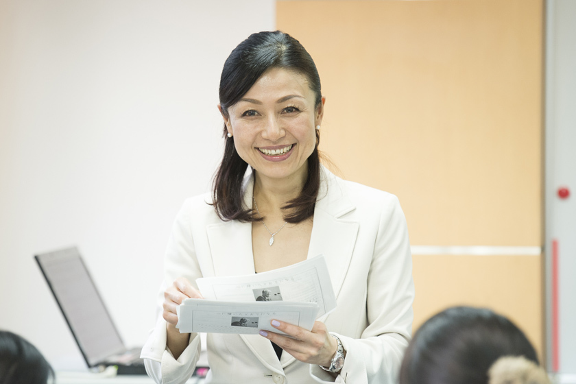 太田先生が担当しているのは就職活動対策の授業です。お辞儀の仕方、電話のかけ方、メールの仕方などビジネスコミュニケーションの基礎を学ぶとともに、「自分の強みを生かして企業に対しどのように貢献したいのか」を学生一人ひとりが自己分析を通して見つけていきます。学生自身が気づいてない「自分の良さ」を先生との対話を積み重ねることで発見し、相手にしっかりと伝えられるようにします。先生は授業を「失敗してもらう場」ととらえ、学生が自由に意見を言える雰囲気づくりを大切にしているそうです。