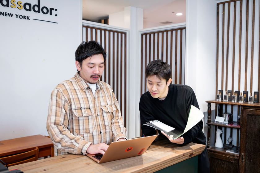 一緒にショップの運営に携わる川西統馬さんと。川西さんは青カレ時代の先輩でもあります。