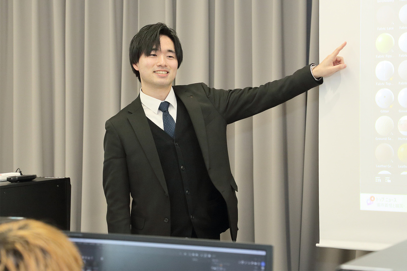 3Dモデラー専攻とCG動画クリエイター専攻にて実施されているこの授業では、Photoshop(R)での描画基礎から、Maya(R)やSubstance 3D Painter(R)を駆使した3Dテクスチャ制作まで幅広く学ぶことができます。また、デジタルスキルの習得だけでなく、色・光・質感の理解を通じた「観察力」の育成を重視しており、表現の土台となる力を総合的に養っていきます。