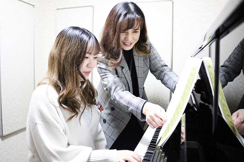山崎先生が指導するピアノ実技は仙台幼児の強みでもある徹底した「マンツーマンレッスン」。基礎はもちろん現場に役立つスキルをレベルに合わせて学んでいきます。初心者は、簡単なコードネームを覚えながら簡易伴奏で弾き歌いをしたり、経験者はどんどん難易度の高い曲にチャレンジ!年度末恒例の「連弾発表会」は、初心者と経験者が協力し合って、本番に向けて練習を積むことで「人間的に大きく成長できる貴重な機会」にもなっているそうです。同じ目標を持った学生同士が切磋琢磨できる雰囲気と、先生と学生との距離の近さも魅力です。