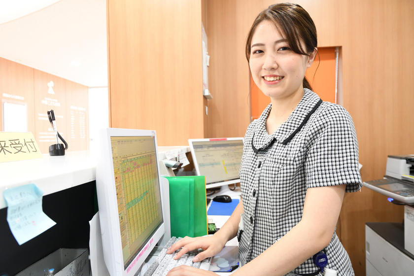 小児専門病院で、受付や会計、診察室業務など、幅広い仕事に携わっています。シフトによってその日に担当する仕事は異なります。受付・会計では保護者の方の応対が中心。診察室業務では患者様の名前を呼んで診察室に誘導したり、診察時にドクターが診察しやすいようにサポートしたり、体重を測ったりしています。患者様はお子様なので、不安を取り除いてあげるのも私たちの仕事。積極的に声がけをしたり、笑顔での応対を心がけています。お子様や保護者様からの「ありがとう」という感謝の言葉に、やりがいを感じています。