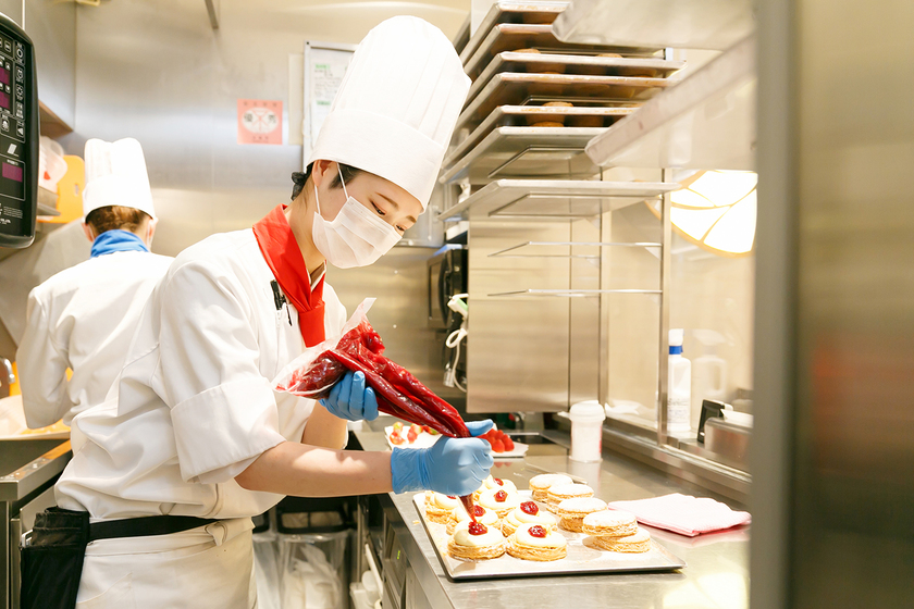 この店舗の主力商品はパイ。なかでも出来立てをお届けするパイバーガーは、季節の新鮮な果物や手づくりのクリームにもこだわった人気商品。工房は売り場の奥にあるので、お客様の声や笑顔にもすぐ近くで接することができ、それが自分のやりがいにもなっています。クリスマスなどのイベント期間は特に忙しく、1日に何kgものカスタードクリームを炊き上げたり、地下にある冷蔵庫へ何度も往復したりと大変でしたが、そのおかげで体力には自信がつきました。最近では商品の試作や新商品の企画など、だんだんと任される仕事も増えています。これからもパイバーガーファンの期待に応えられるよう、こだわりのおいしさを提供していきたいです。
