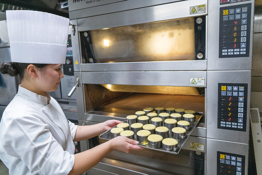 ハレクラニ沖縄 勤務/製菓総合本科 卒/2022年卒/地元の製菓店で働いていたお母様と一緒に、幼い頃からお菓子作りをしてきたKさん。作る楽しさはもちろん、人にあげて喜んでもらう嬉しさも格別で、幼稚園の頃にはすでにパティシエになるのが将来の夢だったそう。「作りたいものを作っては友達にプレゼント(笑)。母からは、素材の特徴や変化、計量の重要性など、考えながら作ることの大切さを教えてもらい、本を読んで勉強したらどんどん面白くなりました」。仕事の現場では、頭で考えるより体で覚えるタイプ。何度も繰り返すことで身に付けてきたという。「同期もたくさんいるので、一人で沖縄に来た私にはとても心強いです」。
