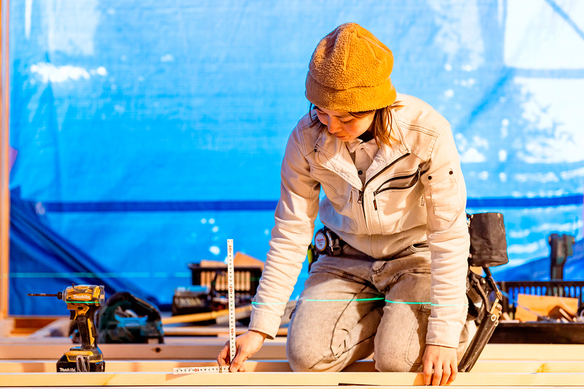 実家の新築工事をきっかけに興味を持ちました。設計士を目指して中央工学校で学び、卒業後は木をふんだんに使う住宅を取り扱う、地元・松本市の工務店(国興ホーム)に就職。設計や現場監督として働く中、腰袋にたくさんの工具を装着し、手際よく道具を使いこなす大工さんの姿に憧れを抱きました。今まで図面上で見ていたものが実際にでき上がっていく様子が衝撃的で、どうしても現場に出たいという気持ちが強くなったんです。そこで直談判して弟子入りし修行の道へ。そのときの棟梁が、今お世話になっている親方なんです。困難に直面することもありますが、親方のフォローのおかげで自分らしく働くことができています。