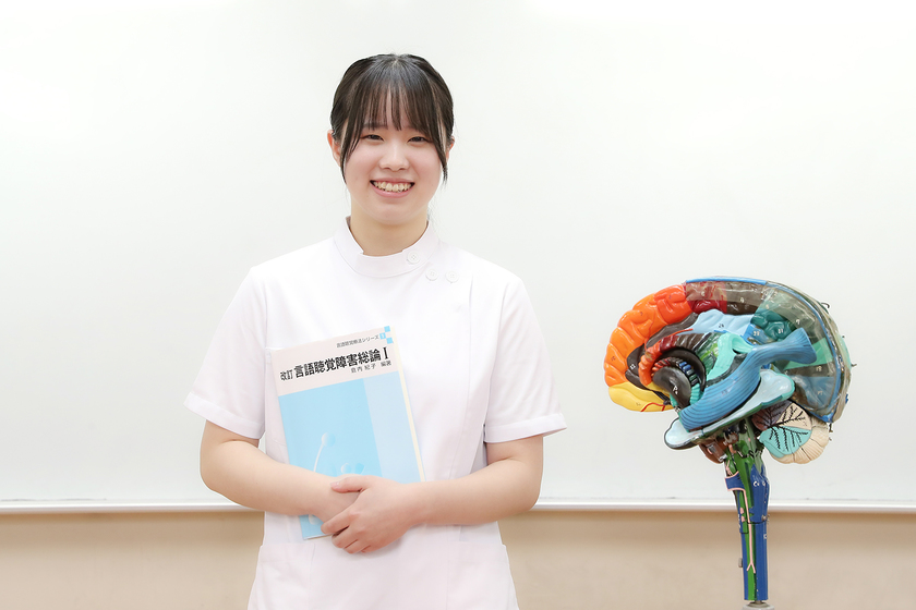 今は、言語聴覚士になるうえで必要な言語学や生物学など基礎となる科目を中心に学んでいます。また、実際に病院での実習や保育実習を経験し、患者様そして子どもたちとの関わり方を学びました。初めて学ぶ分野や科目が多くて勉強は大変ですが、自然と友だちと教え合う雰囲気があるので楽しく勉強することができています。