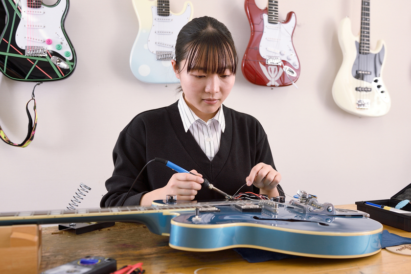 好きな授業は『ギター』です。ネック調整やピックアップの配線、リペア技術などを学ぶのですが、ギターキットを製作した後、アンプから初めて音が出た時はとても感動したことを覚えています。(1コマ90分授業)