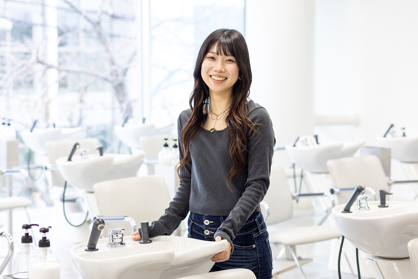 美容師をめざしたのは、寝たきりだった曾祖母が月イチの訪問美容にすごく喜んでいた姿がきっかけ。嬉しそうに鏡を見る様子に「私が笑顔にしてあげたい」と思いました。だから私の目標は、技術でお客様に幸せを届け、気持ちにもしっかり寄り添える美容師。お客様から「また会いたい」と思ってもらえる存在になりたいです。