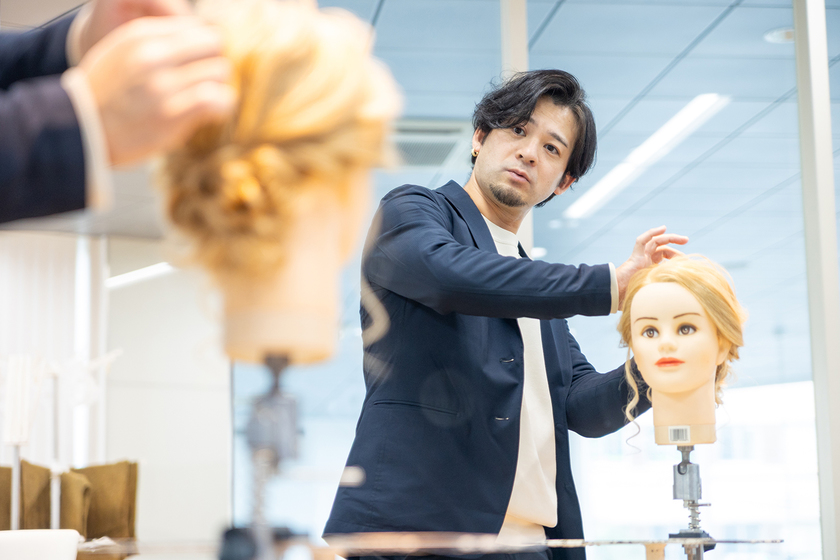 2年生の担任をしながら、国家試験課題や編み込みアレンジ、コンテストヘアの技術などを教えています。大切にしているのは、卒業後に美容師として長く続けていけるための指導です。技術は就職してからでも教えてもらえる。でもその前に、まずは社会人としてどうあるべきか。美容師で一番大事なのは、気配り、心配り。学生のうちから細やかな気遣いができるよう、日々アドバイスしています。特にサロン実習の授業は、カウンセリングから仕上げまで学生が行うので、実践的に接客を学べる機会。サロン現場で必要になる気遣いをリアルタイムで教えています。この時は、先生から美容師の先輩に戻りますね。卒業生が学校に遊びに来て言うんですよ、「先生が言ってたこと、今すごくわかります」って。ああ良かった、間違ってなかったんだなと思える瞬間です。