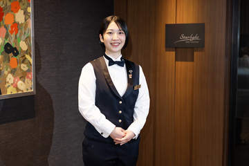 The Okura Tokyo(オークラ東京)料飲部 料飲サービス課 バーラウンジ スターライト所属/ホテル科/2021年3月卒/以前から好きだったというお酒の世界はプロになってさらに広がり、プライベートでも様々なバーに行っているそう。現在の目標はソムリエの資格を取得することで、ワインについても勉強を始めた。入社4年目を迎え、後輩の指導なども行う立場に。「年齢はそこまで離れていなくても、伝え方の難しさを実感しています」と、先輩としてもスキルアップの毎日。「いつかは5階のオーキッドバーでも働いてみたいですね」と、クラシックバーへの憧れを語ってくれた。