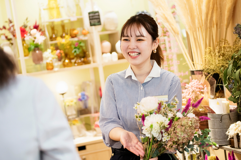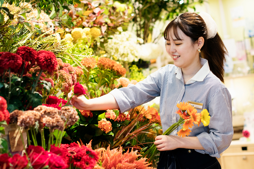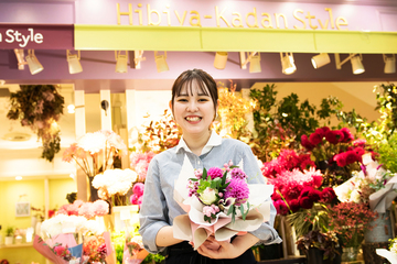 日比谷花壇ではフラワーショップの経営のほかに、ブライダル事業、フューネラル(葬儀)事業、EC事業など、お花に関わるさまざまな事業を行っています。私はショップ店員として、恵比寿にある店舗でお花の水揚げ作業や店舗ディスプレイ、店頭商品づくり、資材の発注などに携わっています。入社してまだ1年目ですが、緊張しながら作った大きな花束を初めてお客様に手渡した際、お客様がとても喜んでくれたのがすごく嬉しく印象に残っています。良い接客をするためには店員同士のコミュニケーションが欠かせないと思うので、お店全体が居心地のいい雰囲気になるようにふだんから先輩や同僚たちと声を掛け合うことを意識しています。