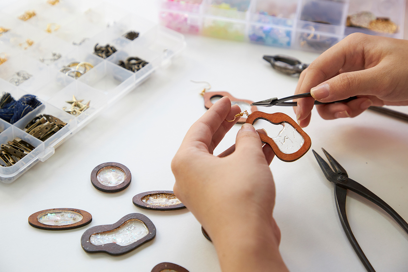 株式会社ユージン 勤務/プロダクトデザイン学科(現・造形デザイン学科)/2020年卒/「モノづくりに興味があり、高校卒業後、名古屋デザイナー・アカデミーに入学しました。」と吉田さん。「進路に悩んでいた時に体験入学に参加。プロダクトデザイン学科の可愛いアクセサリーや素敵な雑貨が展示されていました。それらの作品を見て興味を持ち、ここで学びたいと思い入学を決めました。」在学中は様々なモノづくりに挑戦し、制作に打ち込む日々だったという。現在、いろいろな素材を使ってモノづくりをしている株式会社ユージンで、大好きな「つくる」仕事に励んでいる。