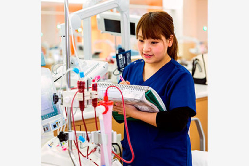 総合病院の人工透析室に勤務し、人工透析を受ける患者さんのケアを担当しています。具体的には、人工透析を開始するとき、血管に針を刺す作業と、人工透析装置の操作が主な仕事です。人工透析の現場は、医療機器と向き合う仕事というイメージを持つ方も多いと思いますが、実際は患者さんの体調チェックをするうえでも、コミュニケーションがとても重要。また人工透析は、患者さんの生命を維持するために欠かせないものとはいえ、拘束時間が長く、患者さんにとってはストレスもかかる治療です。だからこそ少しでもリラックスして透析を受けていただけるよう、いつも笑顔とコミュニケーションを忘れずに、患者さんと接することを心がけています。