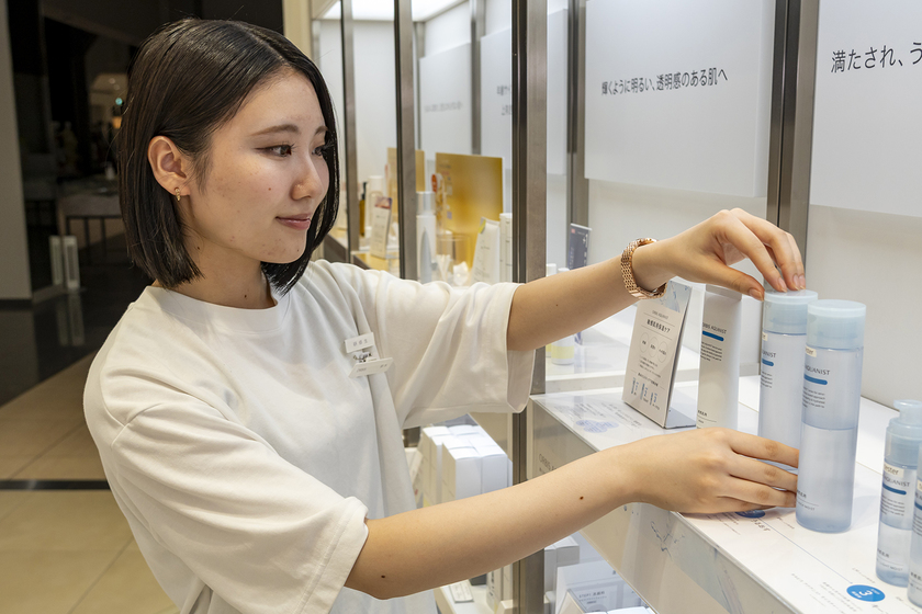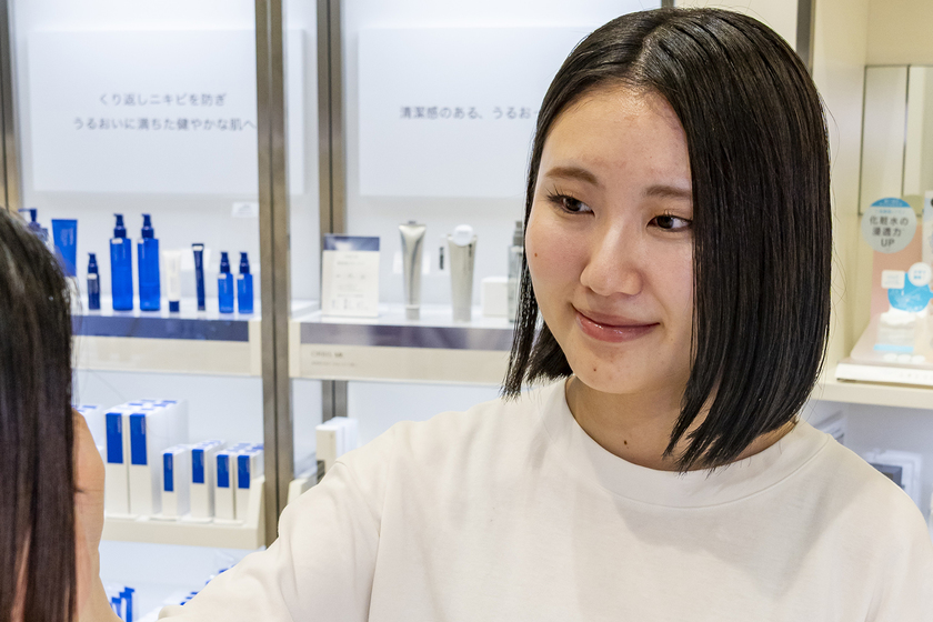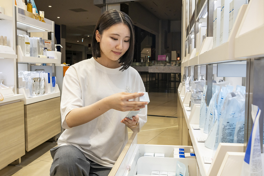 ビューティーアドバイザーとして、お客様一人ひとりの肌悩みに寄り添いながら、スキンケアやインナーケアの提案を行っています。自分自身が肌悩みで辛い時期を経験したからこそ、同じように悩んでいる方の力になれることが、この仕事の一番のやりがいです。お客様と会話を重ねる中で「相談できてよかった」「また来ます」と笑顔で言っていただけたとき、少しでも前向きな気持ちになってもらえたのかなと嬉しくなります。将来は仕事を一つに絞るのではなく、美容や薬にまつわるさまざまな分野に関わりながら、自分の経験や知識を活かして多くの人の役に立てる存在になることを目標に、今は目の前の仕事に一つひとつ向き合っています。