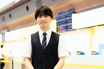 スカイマーク株式会社 東京空港支店旅客第三課 勤務/エアライン学科 グランドスタッフコース/2024年卒/卒業後は、第一志望だったスカイマーク株式会社に入社。「東京ホスピタリティ・アカデミーには在学中から第一志望の会社を決め、それに向かって努力する仲間が多かった」と語る来栖さん。「テストで思うように点が取れなかったり、苦手な英語が伸び悩むなど、壁にぶつかるたびに、本当に自分はグランドスタッフになれるのだろうかと自信を失うこともありましたが、第一志望を変えず信念を持って学んだからこそ今の自分があると思います。皆さんも目標を持ったら、それに向かって頑張り続けてください!」。