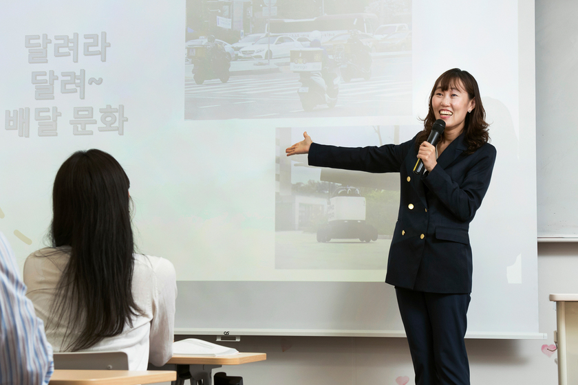 「明るく、楽しく!」が私の授業のモットー。テキストを使ってわかりやすく韓国語・韓国文化を教えています