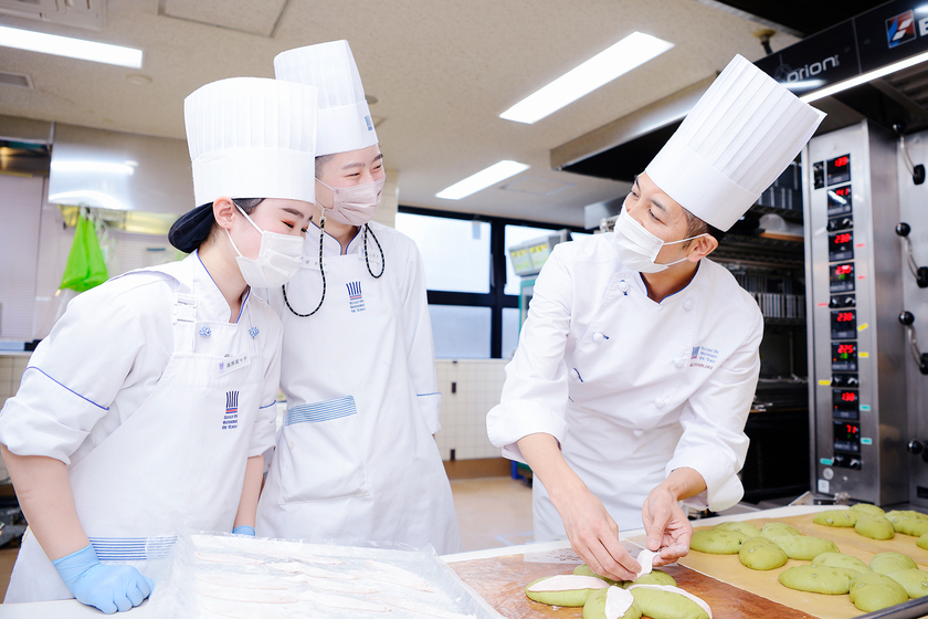 先生が担当している授業は製パン全般。まずは基本をしっかりと学び、いろいろな生地に慣れてきたら、応用の生地や成形などを行っていきます。季節感のあるもの、オリジナルの成形などを取り入れ「パンづくりの楽しさ」を伝えていく魅力ある授業です。基本が身につき応用の段階に入ると、学生の発想を大切にしながら指導していきます。集中すべき時間と遊び心を持つ時間を意識したメリハリある授業は、学生たちの好奇心や向上心を刺激。また先生と学生の距離が近いので、知りたいことやわからないことを積極的に質問できる雰囲気です。