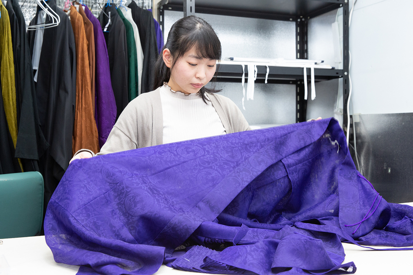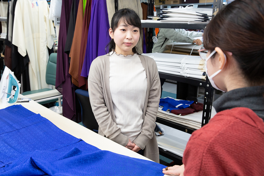 株式会社和光舎 勤務/和裁特別専門学科 卒(現、和裁総合科和裁特別専門コース)/2022年卒/「人に感謝される仕事をし、そしてその仕事に感謝します」という理念に惹かれて株式会社和光舎への入社を決意した藤川さん。和裁士として法衣・袈裟の修繕を担当している。「お客様の大切なお品物を預かりきれいにしてお返しする。この仕事はとてもやりがいがあります」と話してくれました。不器用な自分が和裁士になれたのは、奈良きもの芸術専門学校の先生方のおかげと話す藤川さん。「やさしく見守ってくれた先生方に感謝しています」。
