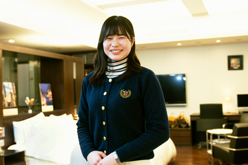 ホテルニューオータニ レストラン課 ステーキハウス「リブルーム」 勤務/昼間部国際ホテル学科 ブライダル科/2024年卒/高校入学前に家族とともに東京へ転居し、高校卒業後、日本ホテルスクール昼間部ブライダル科に入学。在学中にレストランサービス技能検定3級、ホテルビジネス実務検定ベーシック2級を取得。ホテルニューオータニに入社後は宴会課にてサービスを学んだ後、2025年10月ステーキハウス「リブルーム」に配属される。入社後もHRSサービスコンクールにエントリーするなど積極的に活動。休日の過ごし方はショッピングや映画のほか、大好きなテーマパークに出かけるのが楽しみ。