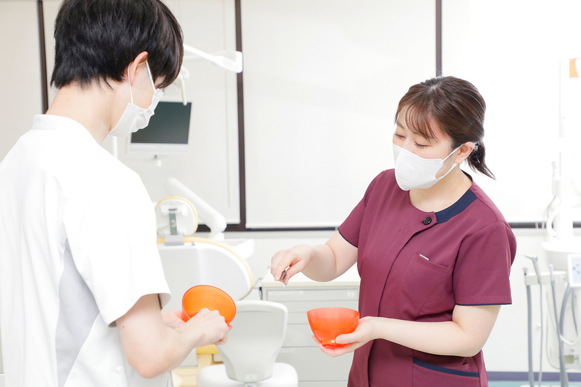 歯型の型どり用材料の練り方もコツが必要。先生のやり方を近くで見ながら練習を重ねていきます