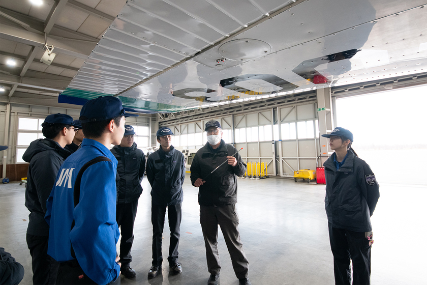 航空整備科の授業の舞台は、空港を再現した日本航空大学校・北海道校の広大なフィールド。「構内タキシング」が可能な環境や、大型旅客機用エンジン等の実機材を活用し、ANA・JALとの提携により一等航空整備士への最短ルートを進める環境が整っています。本授業が扱うのは、国家資格取得に直結するカリキュラムである「飛行前点検」。実際の現場では、機体の安全性を確認し多くの命を預かる上で極めて責任の重い業務です。羽田空港でのインターンシップも見据え、単なる手順の学習にとどまらず、現場で求められる「安全への厳格な責任感」と「実践的スキル」を、この恵まれた環境で徹底的に習得します。