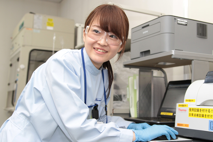 薬に関わる仕事に就きたくて選んだのが日本分析化学専門学校でした。オープンキャンパスでは炎色反応などの実験をさせてもらい、とても楽しかったことを覚えています。在学中は週に2回、1日中実験する日があって、かなり集中して頑張りました。蛍光分光光度計やFT-IR(フーリエ変換赤外分光光度計)など、様々な分析機器の原理を学び、実際に機器を使って分析。測定した値やスペクトルを解析するスキルも習得しました。現在仕事で使っている機器も、学校にあるものと原理は同じなので覚えやすかったです。また、分析結果から物質を判断する方法も学んでいたので、現場でもすぐに対応できましたし、学校での学びはかなり実践的でした。