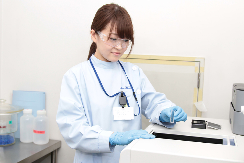 現在、医薬品原材料の受け入れ試験を担当しています。成分が規格に適合しているか、含有重金属などの不純物が規定内かどうか、様々な分析機器を使って試験を行っています。原材料を600℃の熱で完全に焼切る実験などは、48時間かけて細かくチェックするのが大変です。しかし、この原料を使って作られる薬は、患者さんが少しでも良くなるために必要なものです。品質管理をしっかりしないと、手元に届いた時に効かないこともあります。だから、そうならないように責任感を持って、目の前の試験に取り組んでいます。試験結果は成績書にまとめるのですが、担当者欄に自分の名前が入っているのを見ると、改めて仕事のやりがいが実感できます。