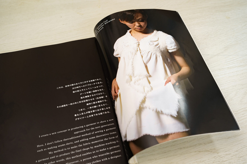 出身の秋田での高校生時代から、友人の服をつくるなどファッションへの関心を深めていました。文化服装学院のアパレルデザイン科では、本格的に服づくりに没頭しました。でもいま振り返ると、その頃つくってた服なんて口に出せるような出来栄えじゃないです(笑)。アパレルデザイン科のあと進学した1年コースの文化ファッションビジネススクール(現・文化ファッション大学院大学)の卒業間際につくったのは、『縫わず洗濯機で作る服』。ウールの原毛をニードルパンチで布に移植し、洗濯機に入れると、ニードルパンチの箇所が半分くらいに縮みます。その縮みを計算して布をサーキュラー形のパターンで裁断して、レディスジャケットにしました。