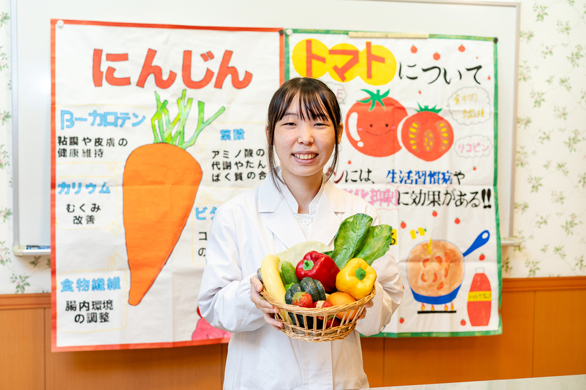 子どもの頃に入院した経験から、美味しい食事を栄養面も考えて作る栄養士に憧れ、医療の現場で食事の面から病気の方をサポートしたいと考えるようになりました。実習でお世話になった病院に内定をいただいたので、今後、働きながら管理栄養士の資格取得を目指します!そのため今も先生から過去問題をいただいて勉強中です。