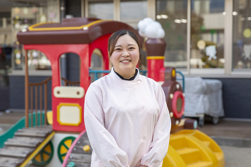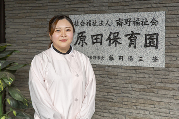 もともと食べることが大好きで、幼稚園の頃の夢はシェフでした。高校時代に調理師免許を取得したのですが、せっかく食事を作るなら栄養のことも学んで、健康に良い食事を作れるようになりたいと思い平岡栄養士専門学校へ進学。そして、子どもに関わる仕事にも魅力を感じていたため、保育園の栄養士になろうと決めました。原田保育園を選んだ理由は、食育に力を入れている点に強く惹かれたからです。月に1度の食育指導だけでなく、プランターで野菜を育てたり、畑で米や芋を育てたりして、自分たちが育てたお米でおにぎりを作って食べるなど、1年を通した食育もあり、子どもたちが楽しそうに向き合う姿を見るたびにやりがいを感じています。