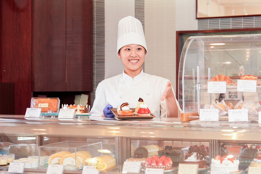 お菓子の製造から販売まで行っています。お客様が楽しそうにお菓子を選ぶ姿を見た時や、「美味しかったよ」と声をかけてもらえた時は心が温まり、とても嬉しい気持ちになります。やりがいを感じるのは、担当している焼き菓子が美味しそうに焼けた瞬間です。パティシエは状況によって臨機応変に対応する力がとても大切で、判断するための知識が必要です。そのため、先輩から教えてもらった時のお菓子の状態や焼き色を覚え、どうしてそうなったのかを常に考えるなど、知識と技術の向上を意識して日々取り組んでいます。今後の目標は、自分の作ったお菓子を店頭に並べること。コンクールなどにも挑戦し、知識を増やしていきたいと思っています。