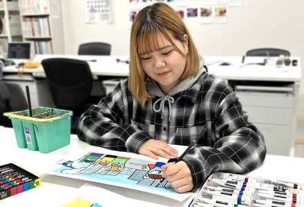 bisenの授業は基礎をしっかりと身につけられるのはもちろん、Webデザインや銅版画など選択科目が豊富でいろいろな分野へ興味を広げてくれるところが魅力です。私はイラストレーション専攻でしたが、グラフィックデザインやDTPといったパソコンの技術も学べ、それが今に役立っています。さまざまな分野で活躍するプロの先生が多く、仕事を進める上でのコツや体験談などリアルな業界の話を聞けたのは期待通りでした。デザインコンテストやコンクールなどに応募する機会もあり、入賞した経験は自信につながりました。先生との距離が近く、担任の先生は転職する際にも親身になってサポートしてくださるなど、卒業後も親交は続いています。