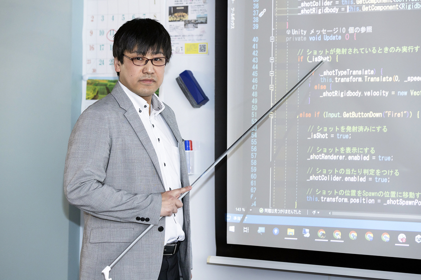 パソコン初心者をゲームクリエイターへと養成する、元システムエンジニアの講師・宮西哲生さんに、在校生の作品を通じて授業で身につくこと、作品制作を通した学生の成長などのお話をうかがいました。