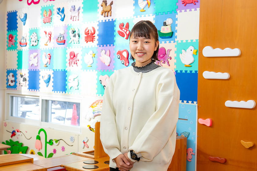 学校法人沼ノ端学園 認定こども園 はくちょう幼稚園 勤務/こども未来学科 幼稚園教諭1種チャレンジコース 卒/2021年卒/穏やかで芯の強さを感じさせる深澤さん。「当園は残業なし、仕事を持ち帰ることもありません。有給休暇もとりやすいです」と、働きやすい環境のため、年に数回旅行をしてリフレッシュしているそう。「ライフステージの変化に応じて仕事を続けたいし、自分の人生を大切にして楽しみながら成長していきたい」とも話してくれた。幼稚園教諭をめざす高校生へのアドバイスとしては、「幅広い年齢層の人と関わるので、バイトや部活などで多くの経験をするのがおすすめ。事務仕事も多いのでパソコンも使えるといいですよ」という。