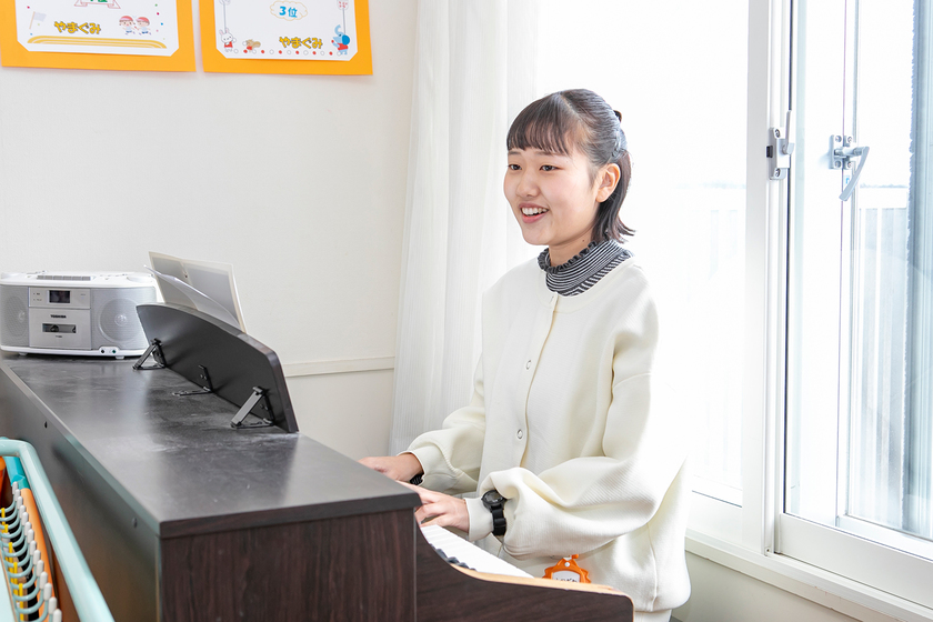 以前から教育関係の職業に就きたいと考えていて、幼稚園の職業体験をした際にこの仕事に興味を持ちました。ただ、ピアノが弾けないため諦めかけていたのですが、オープンキャンパスでピアノ初心者でもマンツーマンで指導していただけて、上達できることを知ったので入学を決意。そして今は、実習先でもあった幼稚園で働いています。実は私、この幼稚園の卒園生なんです。在園していた時の先生に、再び指導してもらうのは不思議な感じでもあります。私がたくさんの先生たちから指導を受けたように、卒園したこどもたちをいつか迎えられるように頑張りたいです。