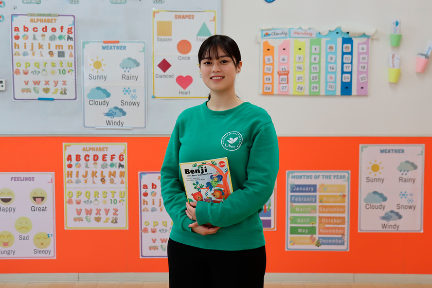 リーベルインターナショナルスクール 勤務/英語科/2023年卒/「私の母の母国語はポルトガル語なので、幼い頃から2カ国語でコミュニケーションを取っていました。そのため母に日本語を通訳することが多く、言語は人と人をつなぐ透明な架け橋のようなもの。同時に国の文化も学べる素敵なことだと思いました。」それが、堀籠さんが英語に興味を持ったきっかけ。とても充実した日々を送っている現在、英語力の向上と新しく挑戦したいことができた時の土台づくりのために「資格取得やTOEICなどで高得点を取れるよう勉強を続けていきます」と目標に向かって力強く前進中だ。