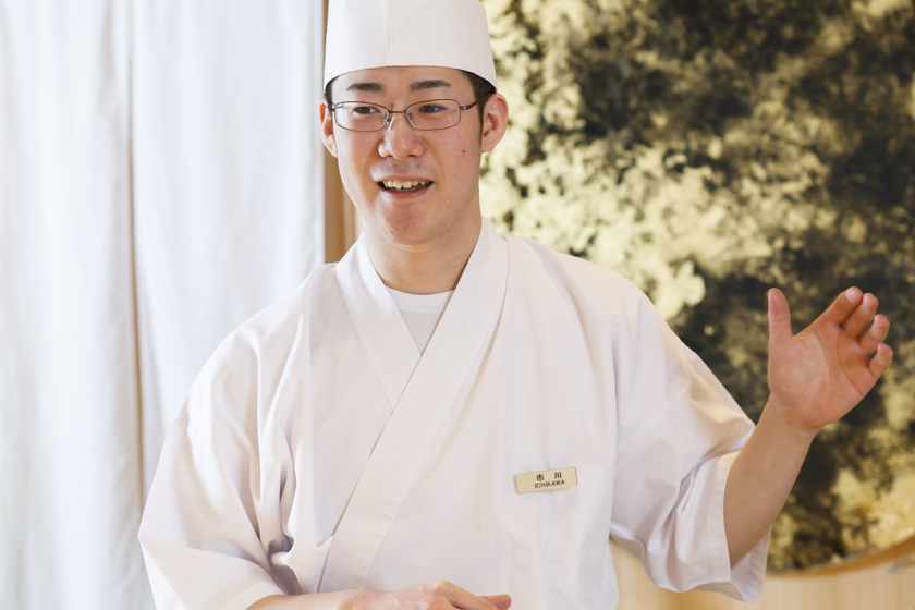 あま木勤務/調理師本科/2022年卒/名古屋観光ホテルの中にある「あま木」ですし職人として働いている市川さん。すしを握ることから提供することまで幅広く担当するこの仕事の難しさは、すしを一つひとつ丁寧に握りながら椀物などを提供するタイミングをはかる必要がある点だそう。ここに経験の差が出るという。後輩へのアドバイスを聞くと、「『興味があるから学びたい』というあいまいな気持ちではなく、『将来はこうなりたい!』という明確な目標を持って仕事に就くことが大切だと思います。強い気持ちがあれば仕事でつらいことがあっても続けられますから。すし職人のような専門職の場合は特にそうだと思います」と教えてくれた。