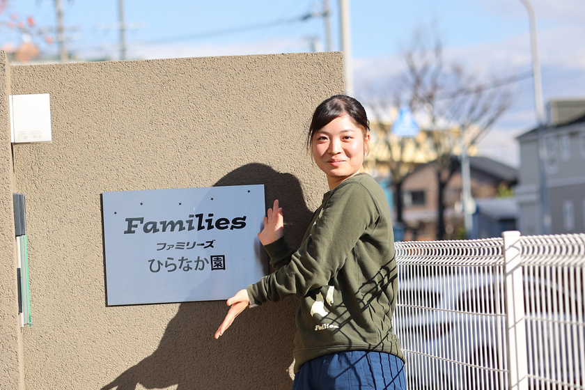 ファミリーズひらなか保育園勤務/保育科 総合こどもコース 卒/2023年3月卒/とても明るい園の中で活発に働いている山崎さん。園長先生を始め名古屋文化学園の先輩先生が大勢いる園なので気持ちよく活動していました。この園では担任が自分の担当クラスだけをみるのではなく、全ての保育士が協力してすべてのクラスを担当するという姿勢。クラス同士の交流も盛んな様子で、年長の子が年下のクラスの子の面倒をみている姿が印象的でした。しっかりした保育理念を持っている園長先生、保育歴30年のベテラン先生、山崎さんより2級先輩の先生とともに楽しく働いている姿にとても好感を持ちました。