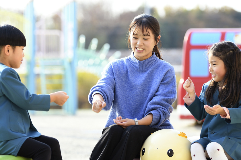 幼保連携型認定こども園「三好文化こども園」勤務/保育科 総合こどもコース 卒/2024年3月卒/布谷さんは1年目はフリー教員としていろいろなクラスの活動に参加。たくさんの保育を学ぶことができたのは大きな収穫だったと思います。その経験の上に自分自身が目指す保育を重ね合わせて、自分なりの保育を樹立していってもらいたいと思います。この園は2024年4月に幼保連携型認定こども園に移行、合わせて新築・移転をしました。広大な敷地にゆとりある園舎が立っています。ある大学の先生から「今まで見た中で最高の園舎」との言葉をいただきました。布谷さんにはこの園舎で存分に力を発揮してもらいたいと思います。
