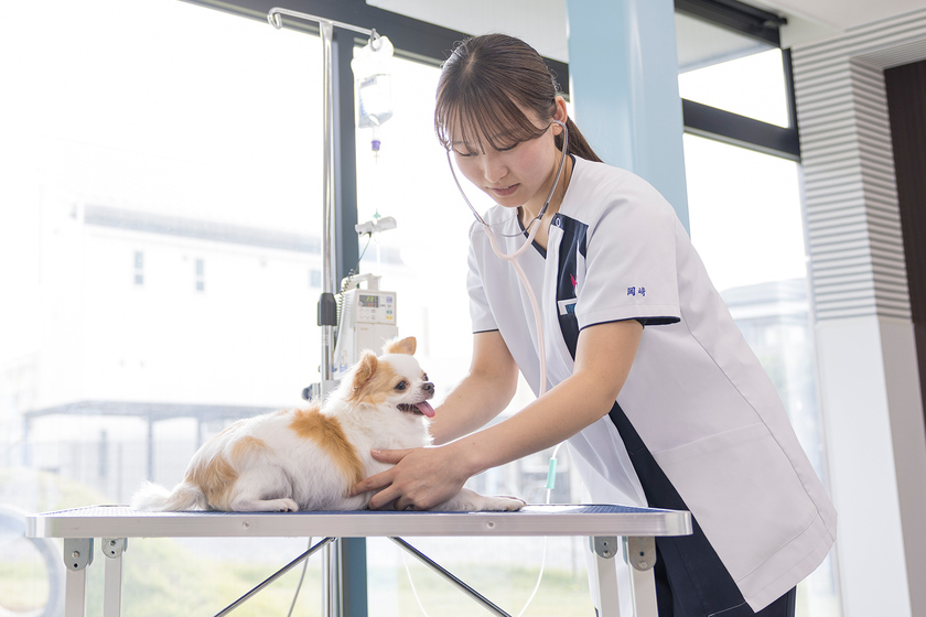 好きな授業は動物内科看護学実習です。ご家庭の愛犬を学校に招いて看護技術を実践します。飼い主さんにとって大切な家族、命を預かる緊張感は相当です。集中力を持続させるのも大変ですが、かわいい表情や仕草なども見せてくれるので、ワンちゃんたちに会えることが楽しみでもあります。