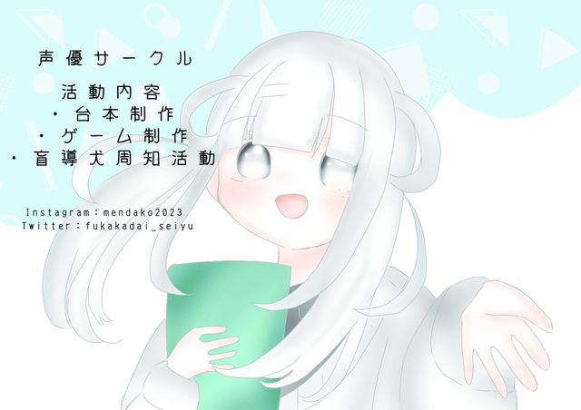 声優サークルでは台本制作や動画編集、ゲーム制作等様々な活動を行っています。また、盲導犬の周知活動等の学外でのコラボ活動や学内でリーディングライブ等のイベントを行っています。
